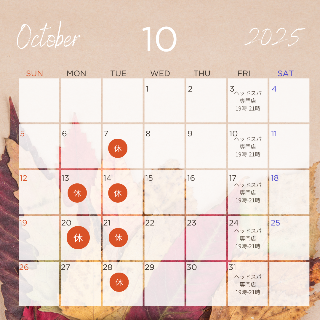 10月定休日 2025.09.24 毎週金曜日の晩(19時~21時)はヘッドスパ専門店の日となります☆ 昼間はサロンの営業になりますのでよろしくお願い致します(*´∀`) Deep Tweet Share +1 Hatena Pocket RSS feedly Pin it Googleマップの口コミにご協力お願いします 11月定休日