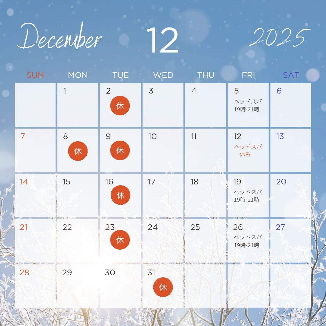12月定休日 2025.11.26 ※30日㈫は営業しています。 ☆ヘッドスパ営業について 12月12日㈮は誠に勝手ながらお休みとさせて頂きますm(_ _)m よろしくお願い致します。 Tweet Share +1 Hatena Pocket RSS feedly Pin it 11月定休日 年末年始のお知らせ