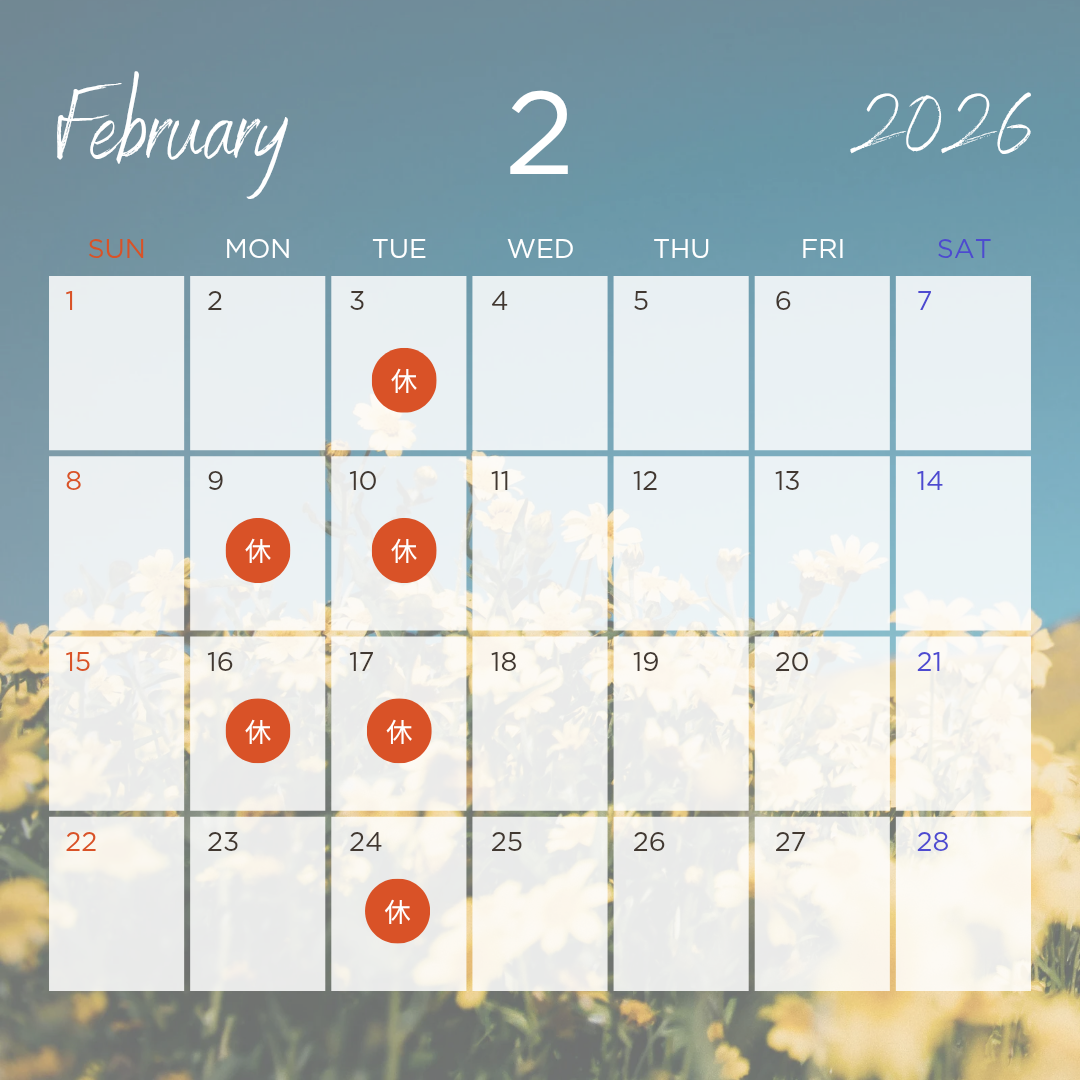2月定休日 2026.02.01 2月の定休日です(・∀・) ※2月5日は •カット 15時最終受付 •カラー☆パーマ 14時最終受付 •カラー&パーマ 13時最終受付 と早めになりますのでよろしくお願い致しますm(_ _)m 毎週金曜日はヘッドスパ専門店の日です✨ 19時•20時のご予約案内となります! よろしくお願い致します( ꈍᴗꈍ) Tweet Share +1 Hatena Pocket RSS feedly Pin it 1月定休日