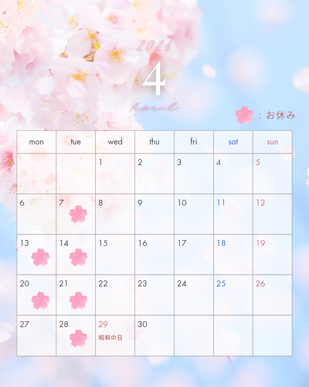 4月定休日 2026.03.27 よろしくお願いします! 5月の臨時休業のお知らせ ★5月13日(水) は臨時休業とさせて頂きます、ご迷惑おかけしますがよろしくお願い致しますm(_ _)m Tweet Share +1 Hatena Pocket RSS feedly Pin it 3月定休日 5月臨時休業のお知らせ