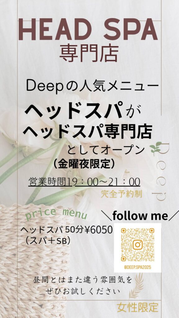Deepヘッドスパ専門店open 2025.08.08 Deepの人気メニューのヘッドスパを今より “リラックスに特化した環境で体験してもらいたい” と思い この度曜日限定で少しの時間ではありますがヘッドスパ専門店としてopenすることになりました! 9月からのopenとなりますので、夏の疲れを癒しに来ていただければと思います\(^^)/ お待ちしてます♡♡ Tweet Share +1 Hatena Pocket RSS feedly Pin it 8月定休日 9月定休日
