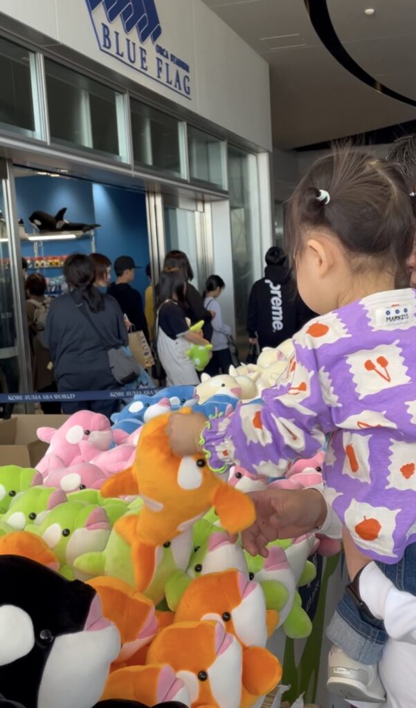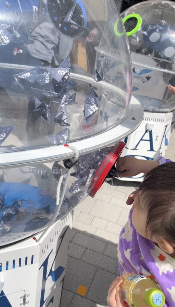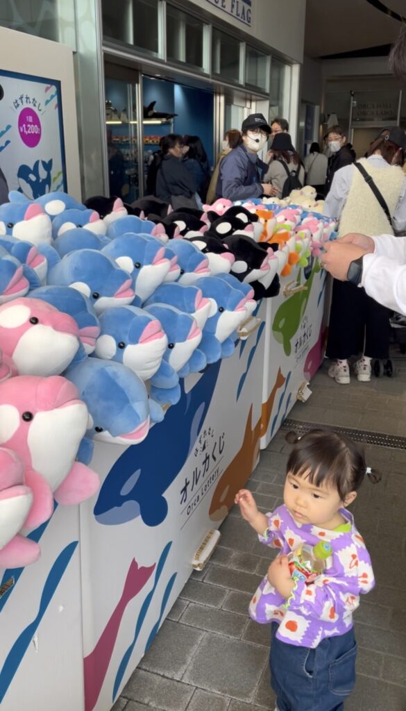お土産屋さんの前でシャチのぬいぐるみが当たるくじ引き(ハズレなし)をして